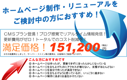 | CMSパック(WordPress) ブログ感覚でリアルタイム情報発信! 更新費用がゼロ!トータルコスト削減!! 全6ページのホームページになります。 左側サイトはあくまでもサンプルパターンのサイトになります。 CMSパックについてお問い合わせ |